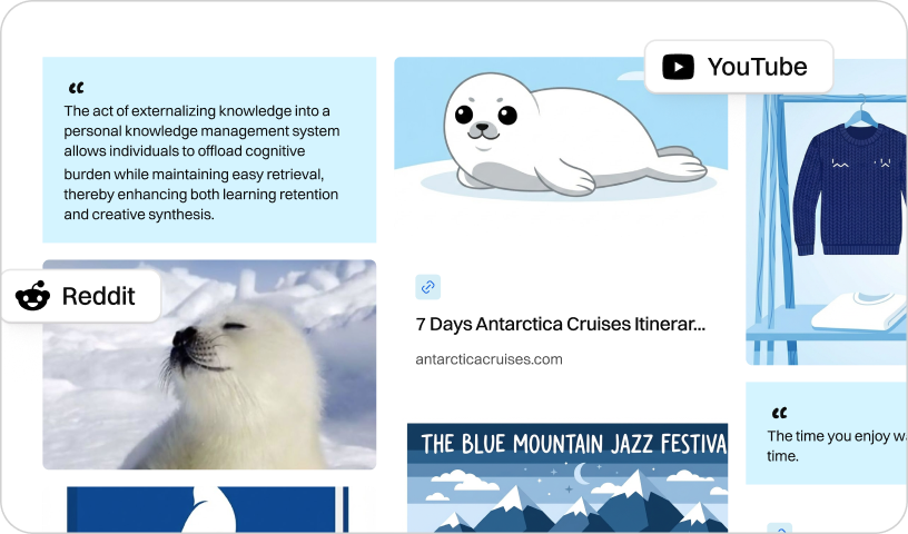 Text, images, links, and highlights — captured in one place and sorted by AI. Your knowledge board grows with every tab you open.